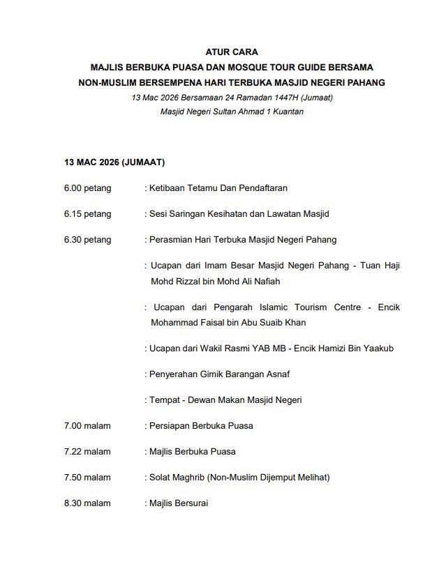 Date: 14 March 2026Time: 8.00am to 12.00pm and 5.00pm to 7.20pmVenue: Masjid Sultan IskandarMasjid Sultan Iskandar invites individuals of all walks of life to ...